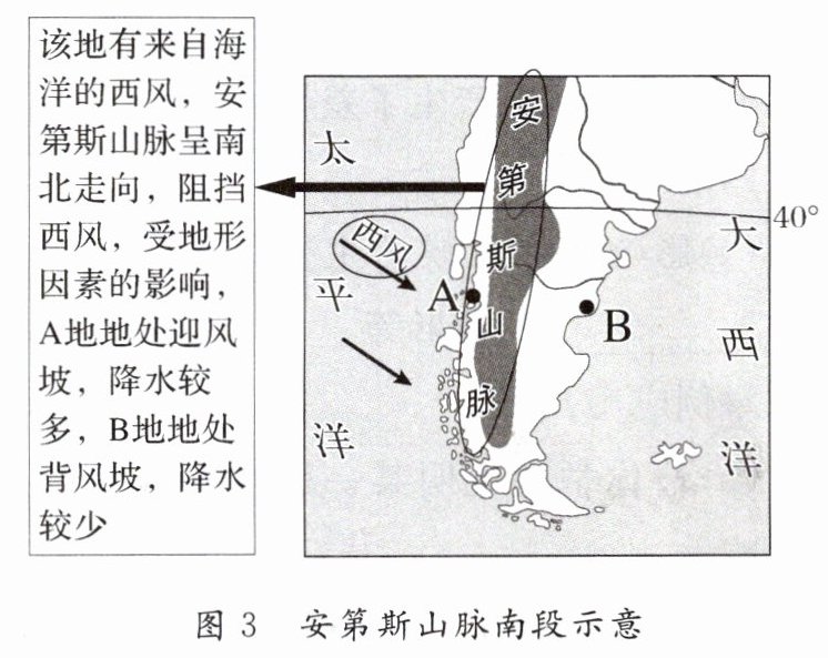 (3) 图 3 中安第斯山脉南段东西两侧景观明显不同,如西侧的 A 地为茂密的森林,东侧的 B 地为草原或荒漠,其原因是____对空气运动的阻挡作用,使山脉东西两侧水分和气温状况产生了差异。