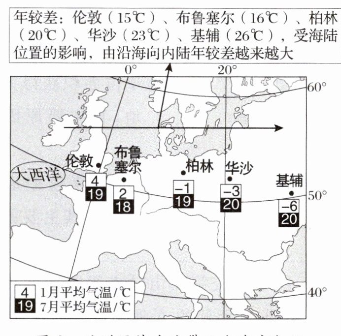 (2) 图 2 中自西向东气温年较差逐渐____(填“增大”或“减小”),其主要原因是____。
