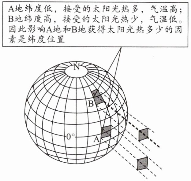 (5)纬度位置:赤道附近全年高温,两极地区终年寒冷。或海陆位置:我国东南沿海地区降水较多,西北内陆地区降水较少。