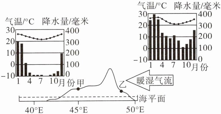 <figcaption>某岛屿沿 20°纬线的地形剖面图及甲、乙两地年平均气温曲线和各月降水量柱状图</figcaption>