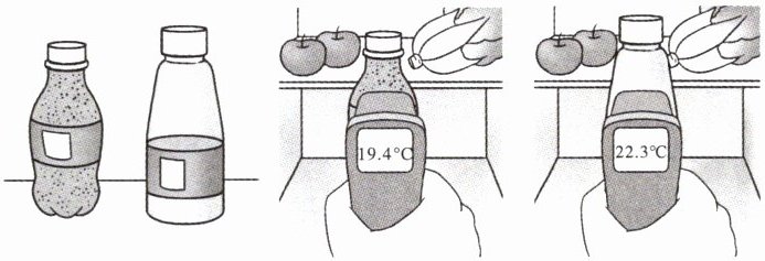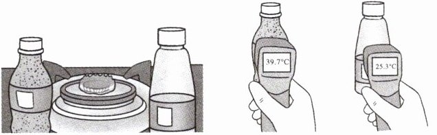 实验基本步骤:1. 将土瓶和水瓶放入冰箱冷藏 5 分钟并测量温度;2. 等待恢复室温实验后继续进行;3. 将土瓶和水瓶放在天然气灶旁加热 5 分钟并测量温度。读图,完成 7~8 题。