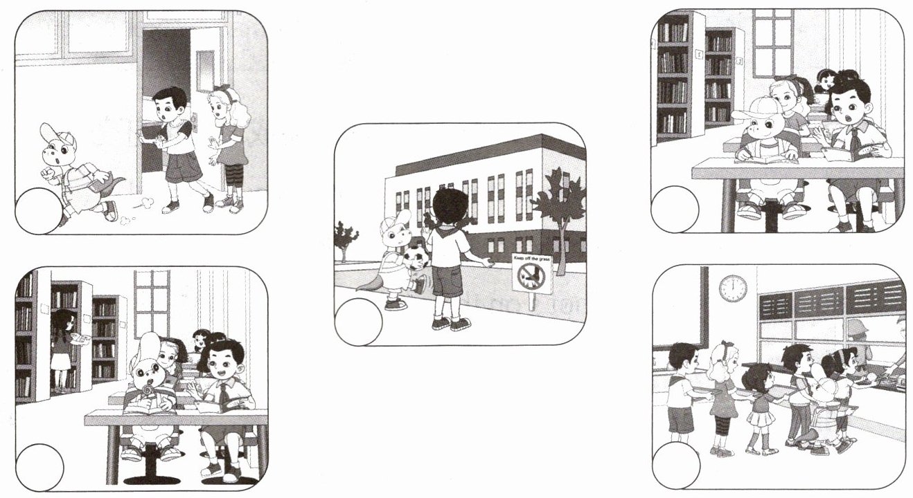 5. Look, read and choose. 看图片中的情景,你想对丹尼说什么?从第4题的句子中选一选,将标号写在圆圈里。