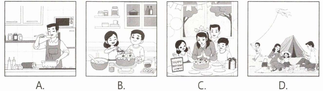 Today is a big day. It's my mum's birthday. My dad makes a big meal. My sister and I make a birthday cake. How many candles are there on the cake? Four! One candle marks ten years. It's a surprise. We also have some red flowers for our mum. She is happy. Then she closes her eyes and makes a wish. We sing "Happy Birthday" to her. And she wishes us to stay happy and healthy.