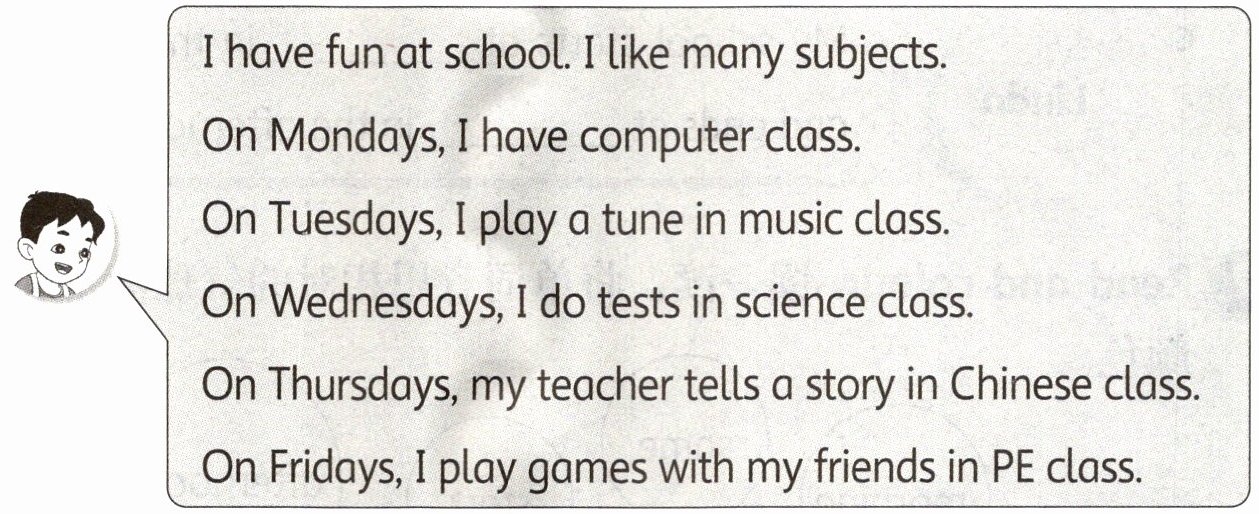 4 Read, match and write. 读短文,将表述星期的单词写到相应活动下,再写一写自己。