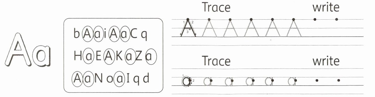 Upper - case "A": Trace and write as shown in the example (already given in the trace part, write several more on the line).
