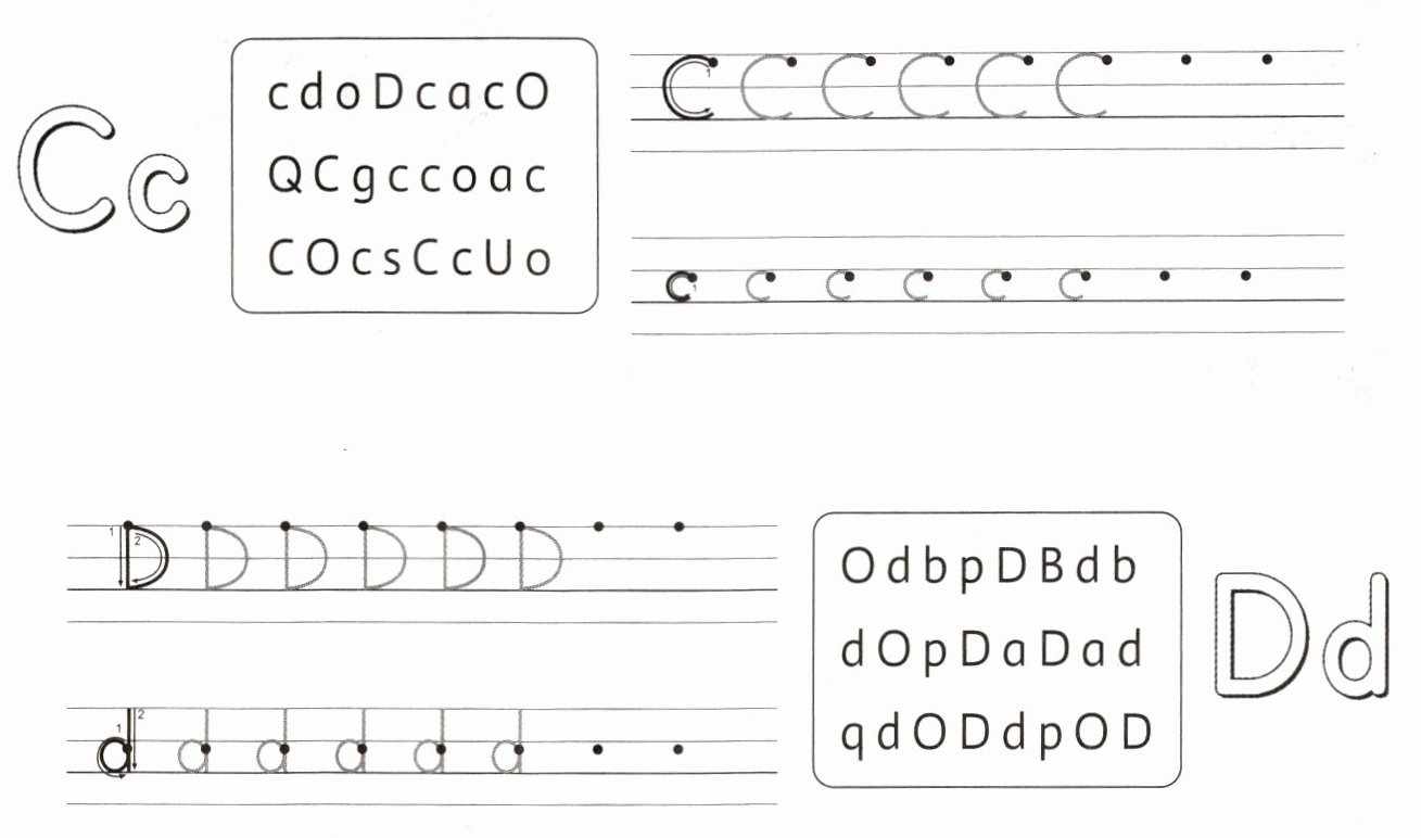 Upper - case "D": Trace and write as shown in the example (already given in the trace part, write several more on the line).