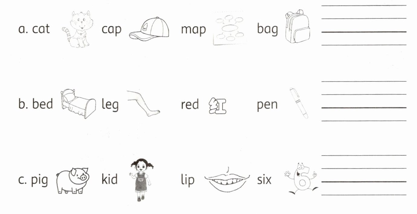 3 Find, write and read. 找一找每组单词共有的字母,写下它的大小写形式,并读一读单词。