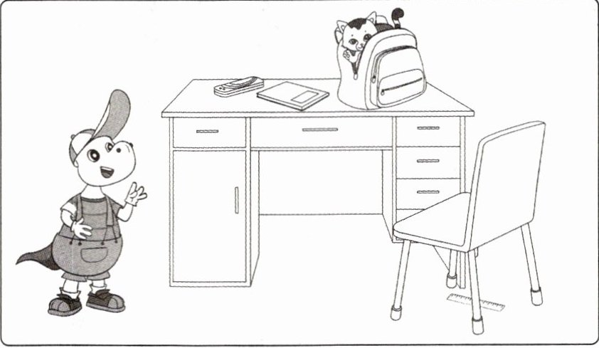 Hi! I'm Tom. This is my classroom. It's big and tidy. This is my desk. My schoolbag is on it. I have five black pencils. They are in the pencil box. I have an orange ruler. Oh! Where is it? Is it in the pencil box? No. Look! It's under the desk.