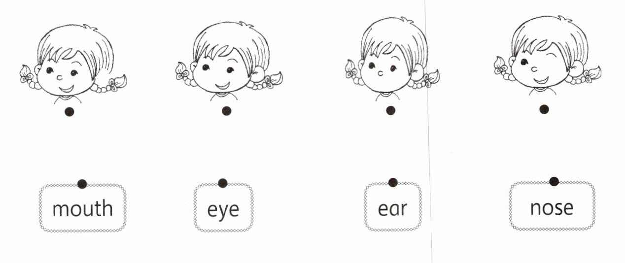 2. Draw, match and write. 下面的人物面部图少了什么?补图并连线,然后写一写。