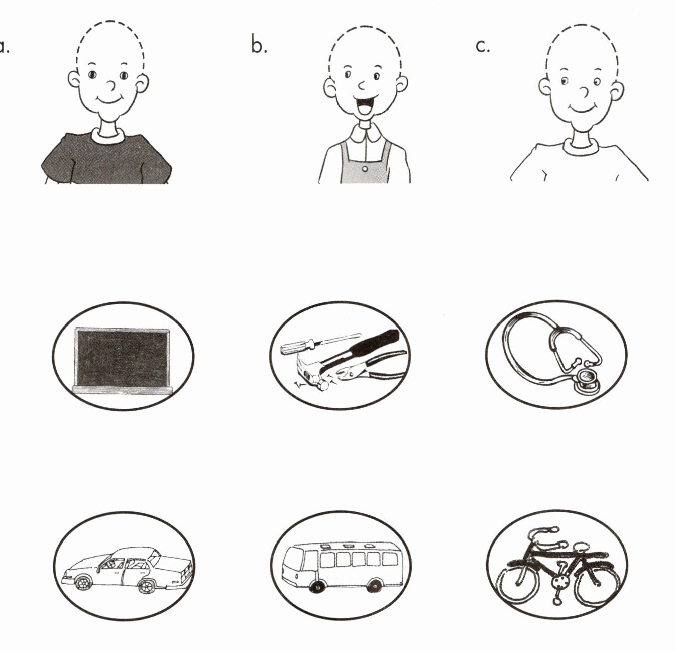 1. a. 短发,白发,棕色眼睛——黑板——汽车 b. 长发,黑发,黑眼睛——听诊器——汽车 c. 短发,红发,绿眼睛——工具——自行车