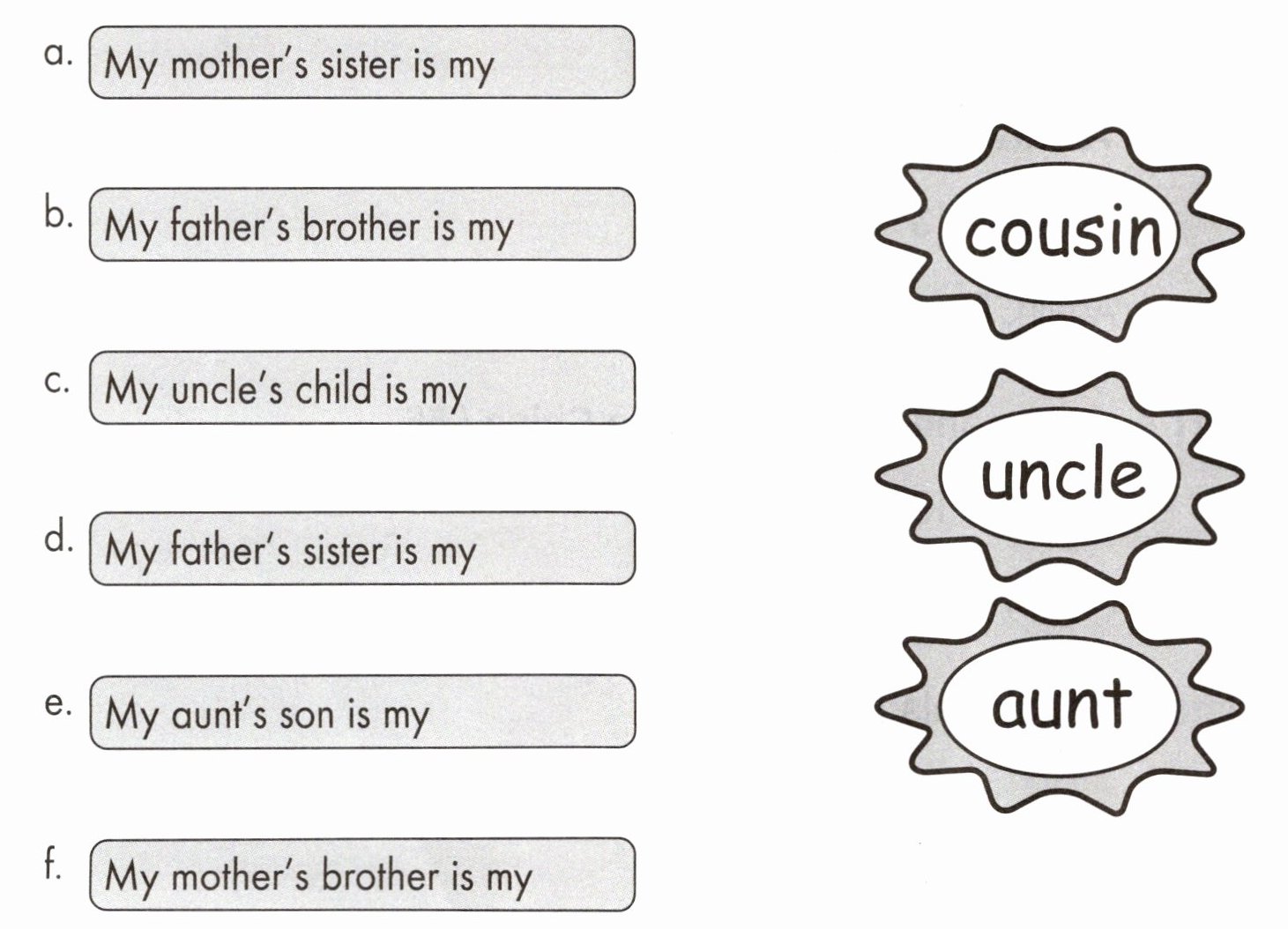 a. aunt b. uncle c. cousin d. aunt e. cousin f. uncle