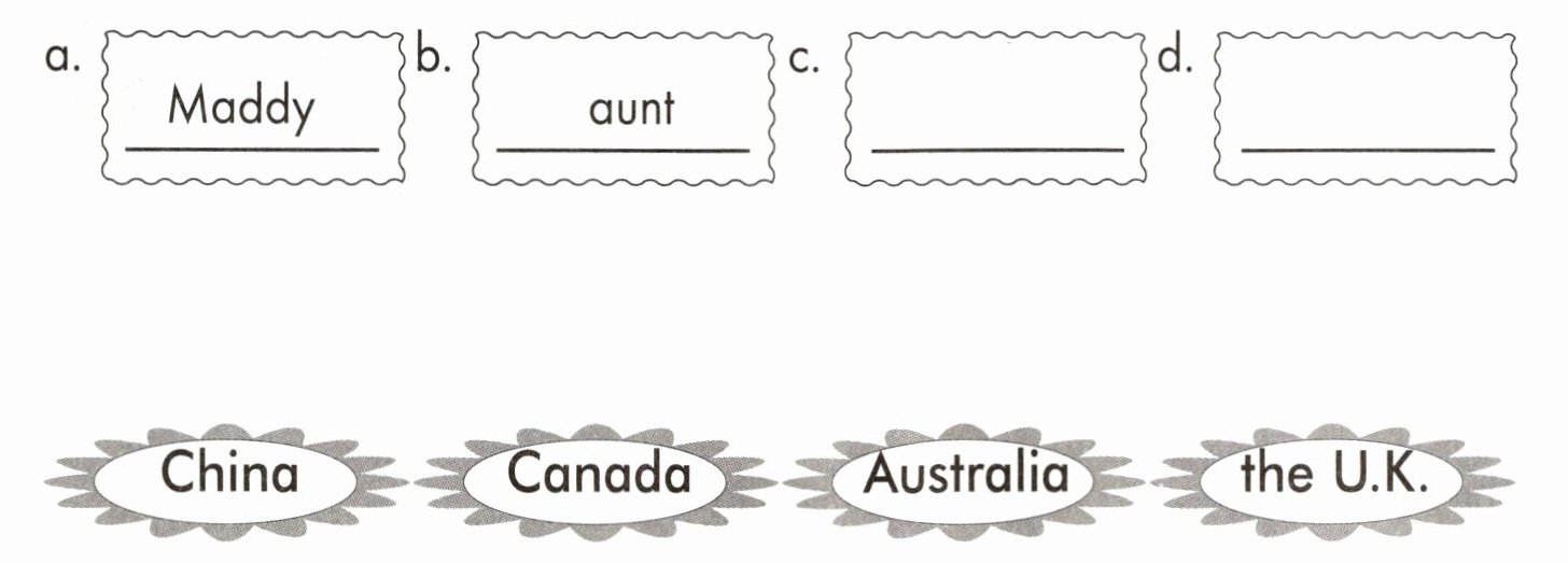 1. a. Canada b. the U.K. c. uncle, Australia d. cousin, China
