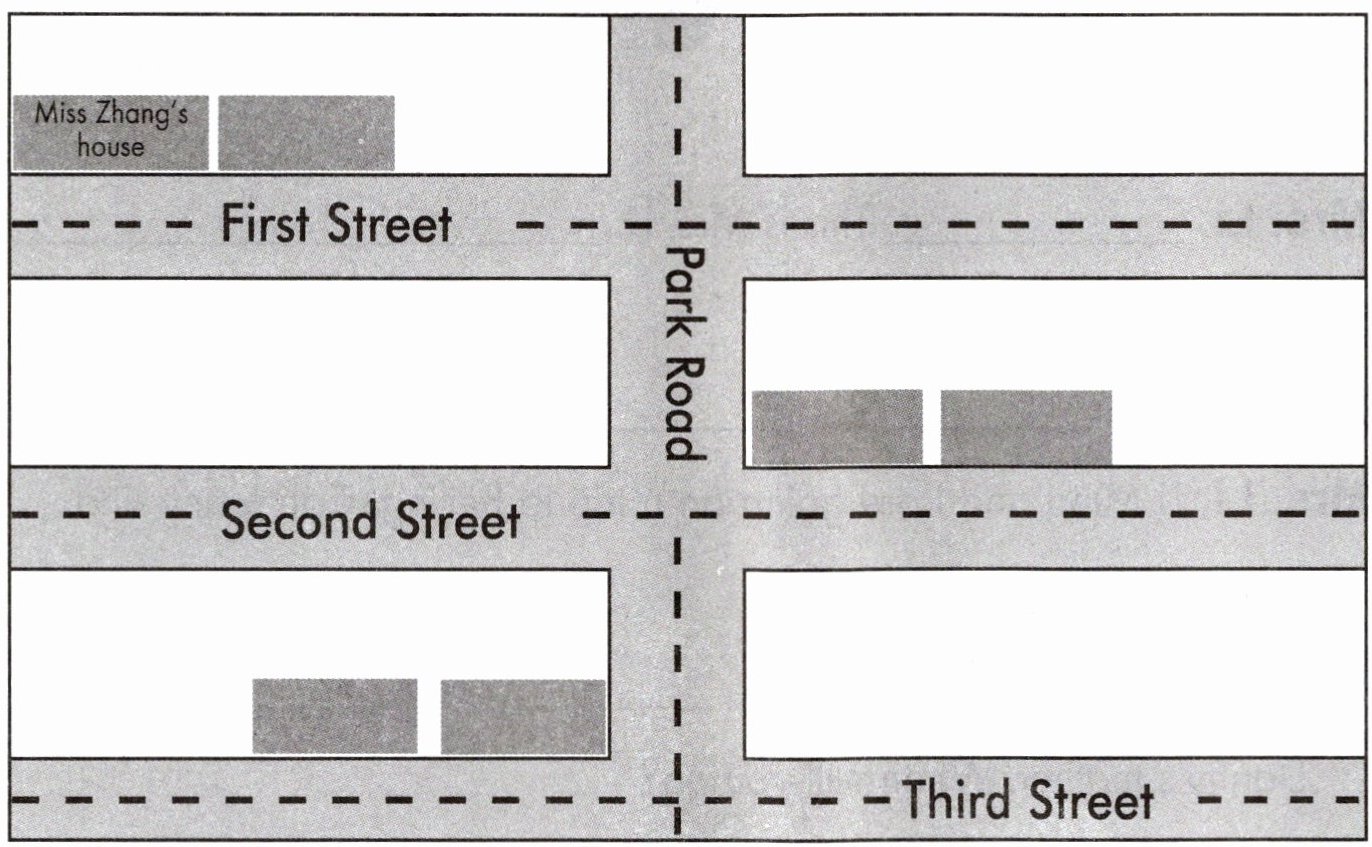First Street: Li Ming's house Second Street:shop restaurant Third Street: library school