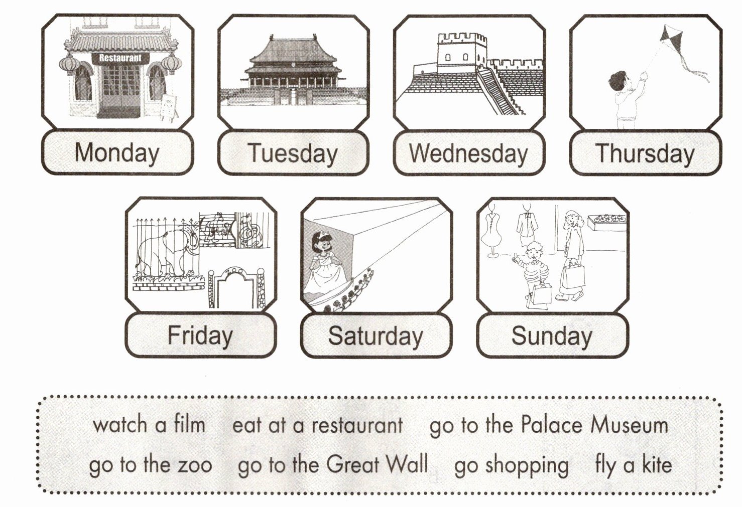 eat at a restaurant. On Tuesday, I will go to the Palace Museum. On Wednesday, I will go to the Great Wall. On Thursday, I will fly a kite. On Friday, I will go to the zoo. On Saturday, I will watch a film. On Sunday, I will go shopping.