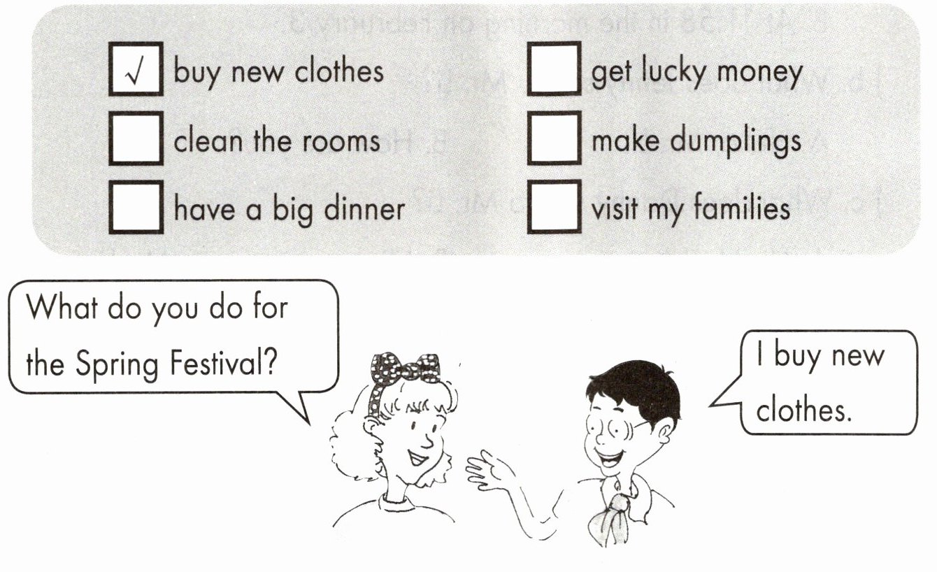 I clean the rooms. I have a big dinner. I get lucky money. I make dumplings. I visit my families.