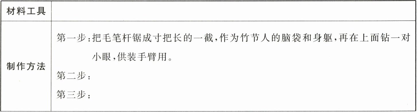 | 制作方法 | 第一步:把毛笔杆锯成寸把长的一截,作为竹节人的脑袋和身躯,再在上面钻一对小眼,供装手臂用。 |