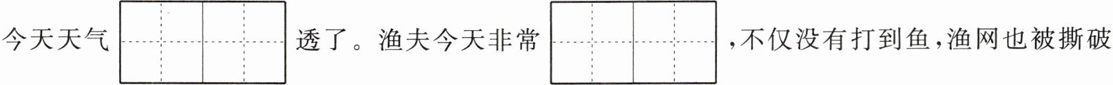 今天天气zāo gāo透了。渔夫今天非常dǎo méi,不仅没有打到鱼,渔网也被撕破了,身上还shī lín lín的。返回家中的路上,他zhòu着眉头,摸着后脑sháo nán nán自语:“穷人的日子真kùn nan啊!”
