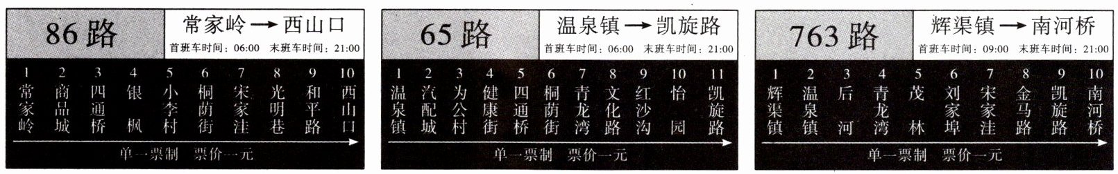 3. 周末,家住温泉镇的小王同学要去凯旋路的小陈同学家复习功课,他可以选择乘坐______路或______路公交车。如果想要停靠的站点较少,可以选择______路公交车。如果约定的见面时间是早上 8 点,就只能选择______路公交车,因为______。