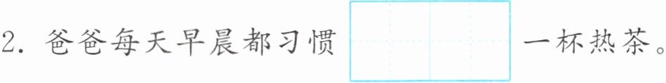 2. 爸爸每天早晨都习惯$\begin{array}{|c|c|}\hline yǐn yòng \\ \hline \end{array}\\ \hline $一杯热茶。