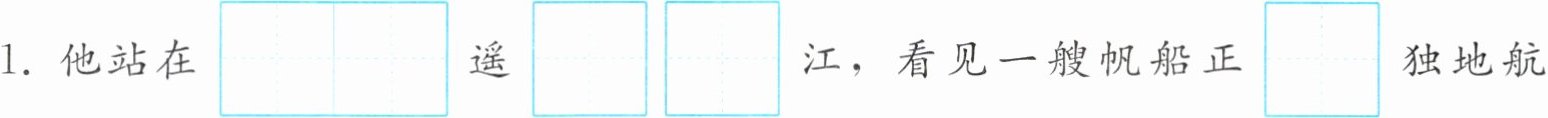 1. 他站在$\begin{array}{|c|c|}\hline àn biān \\ \hline \end{array}\\ \hline 遥\begin{array}{|c|c|}\hline wàng chǔ \\ \hline \end{array}\\ \hline $江,看见一艘帆船正$\begin{array}{|c|}\hline gū \\ \hline \end{array}\\ \hline $独地航行着。