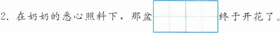 2. 在奶奶的悉心照料下,那盆$\begin{array}{|c|c|} \hline & \\ \hline & \\ \hline \end{array}\begin{array}{|c|c|} \hline & \\ \hline & \\ \hline lán huā$终于开花了。