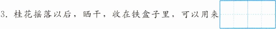 3. 桂花摇落以后,晒干,收在铁盒子里,可以用来$\begin{array}{|c|c|c|} \hline & & \\ \hline & & \\ \hline \end{array}\begin{array}{|c|c|c|} \hline & & \\ \hline & & \\ \hline pào chá。$
