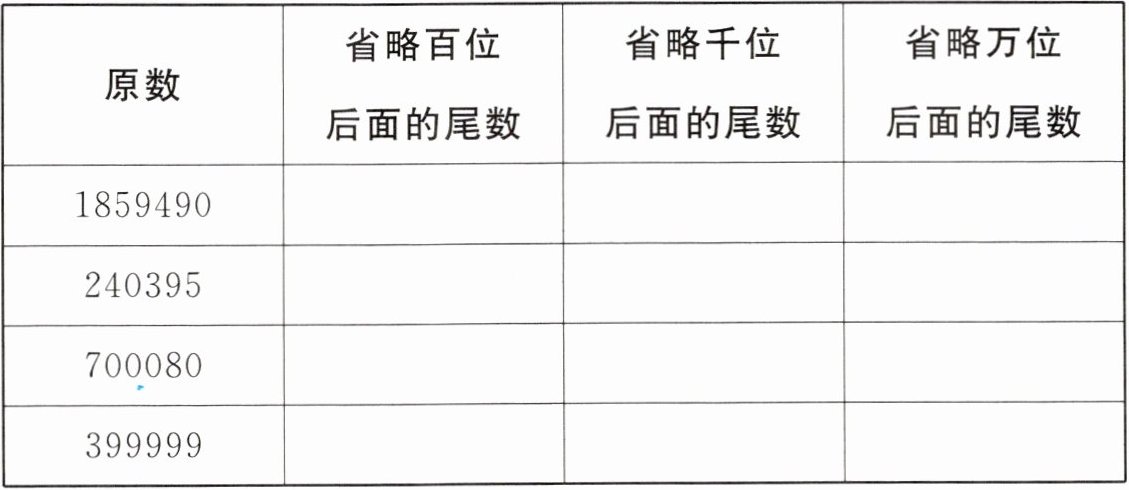 |原数|省略百位后面的尾数|省略千位后面的尾数|省略万位后面的尾数|