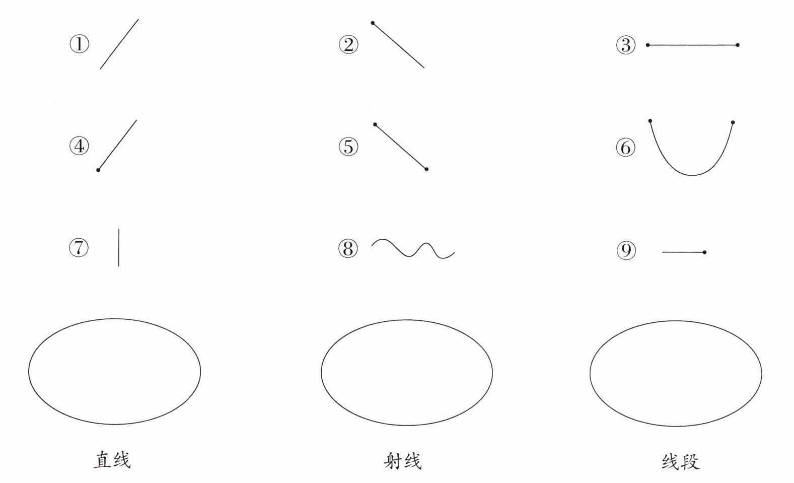 直线:①⑦ 射线:②④⑨ 线段:③⑤