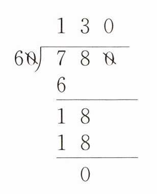 1. $\begin{array}{r}130 \\ 60\enclose{longdiv}{780} \\ 6 \\ \hline 18 \\ 18 \\ \hline 0\end{array} $