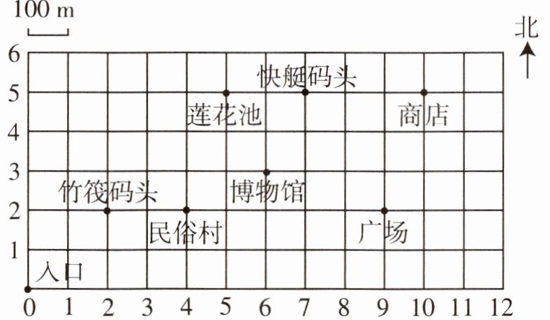 (1)200 400 (2)(10,5) 100 北 300 (3)略 (4)他先后去了竹筏码头、民俗村、博物馆、快艇码头和商店,还有莲花池、广场和咖啡馆没有去。