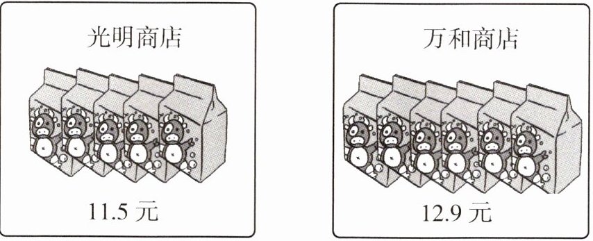 11.5÷5=2.3(元) 12.9÷6=2.15(元) 2.3元>2.15元,所以万和商店的牛奶更便宜。