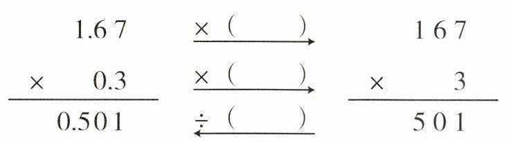 1. $\begin{array}{r} 1.67\\ ×0.3\\ \hline 0.501\end{array} $ $\xrightarrow{× (\quad)}$ $\begin{array}{r} 167\\ ×3\\ \hline 501\end{array} $