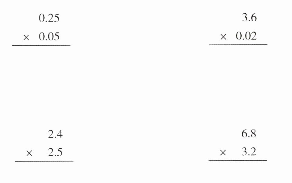 $\begin{array}{r}2.4\\×2.5\\\hline\end{array}\\\hline $$ $$\begin{array}{r}6.8\\×3.2\\\hline\end{array}\\\hline $