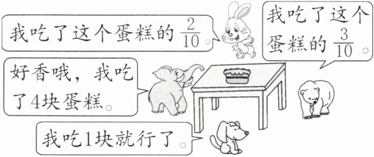 1. 小象吃了$\frac{( )}{( )}$个蛋糕,小狗吃了$\frac{( )}{( )}$个蛋糕。