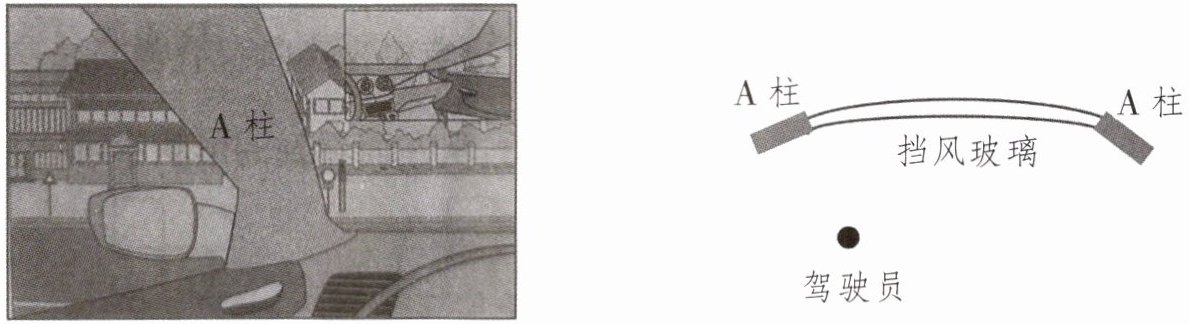 3. 如下图所示,汽车挡风玻璃两侧的 A 柱(左、右各一个),会对汽车驾驶员的视线形成遮挡,请在下面示意图中画出驾驶员视线被遮挡的区域。