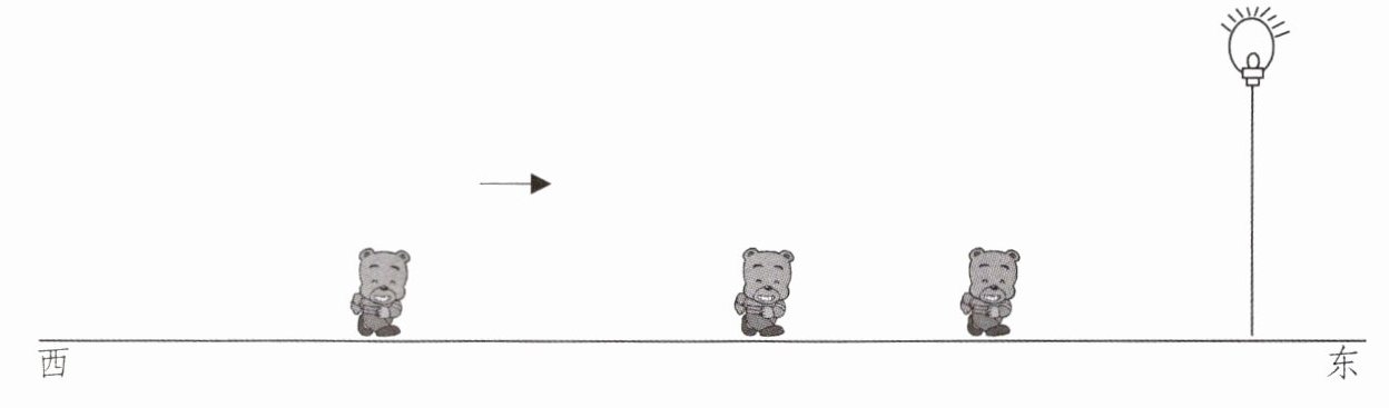 (1)晚上,熊从西向东按如图所示方向行走。画出路灯下熊在不同地点的影子。