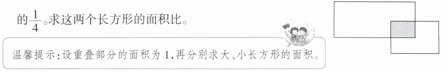 5. 如图,两个长方形重叠部分的面积相当于大长方形面积的$\frac{1}{6}$,相当于小长方形面积的$\frac{1}{4}$。求这两个长方形的面积比。