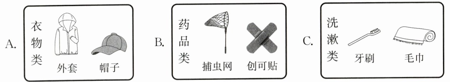5. 乐乐为出行准备了以下物品,其中分类不合理的一项是( )。