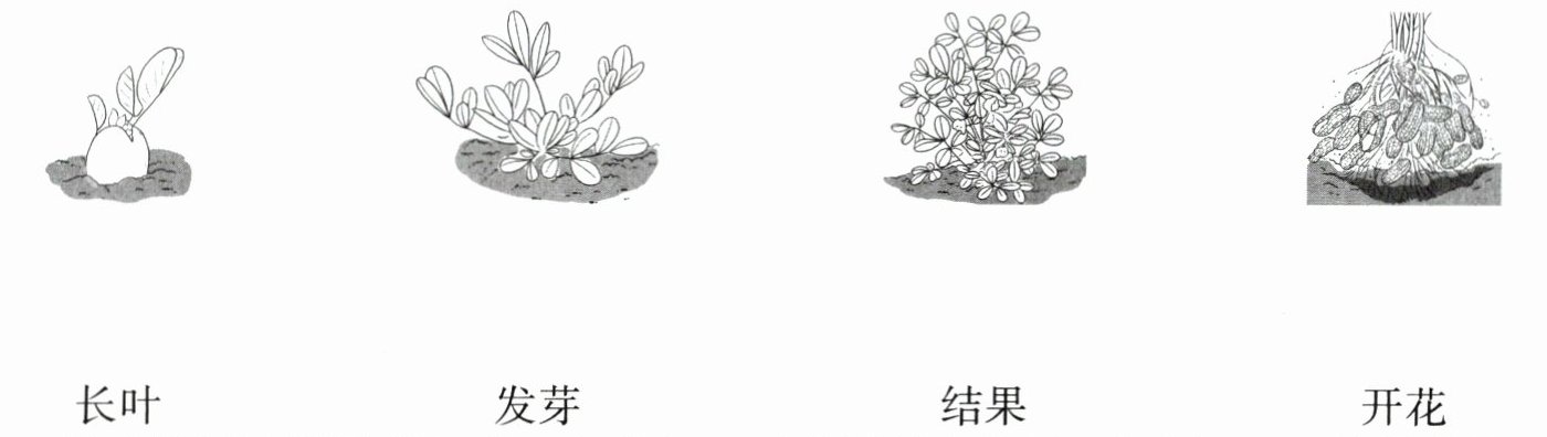 (3)乐乐翻开《生命的奇迹立体书》,看到了“花生成长图”,请结合生活经验,把描绘花生的生长过程的图画与文字连起来。(4分)