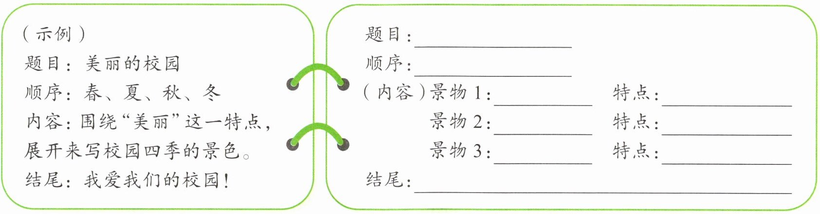围绕“美丽”这一特点,展开来写校园四季的景色。