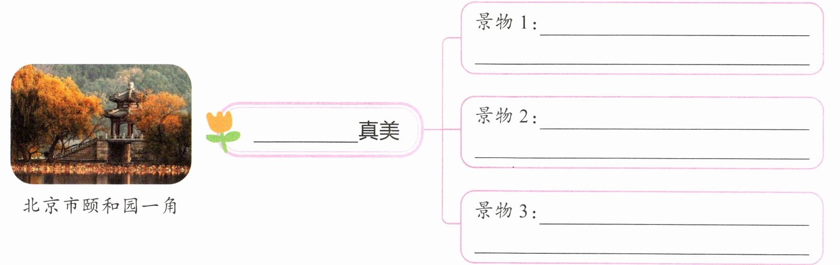 下图中有哪些景物?它们分别是什么样子的?填一填。