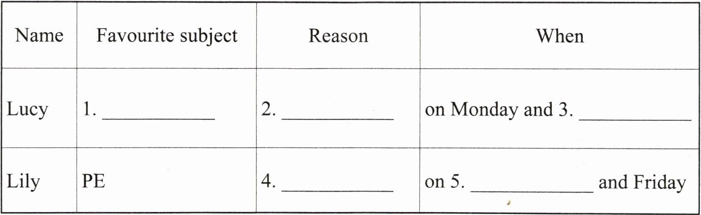 1. science 2. useful 3. Wednesday 4. interesting 5. Tuesday