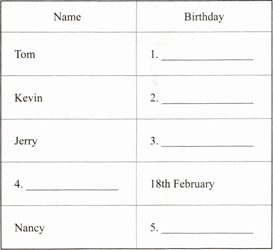 1. 15th July 2. 13th November 3. 2nd March 4. Mary 5. 7th September