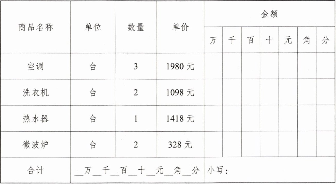 3. 下面是王叔叔在百货中心购物的清单,你能把它补充完整吗?