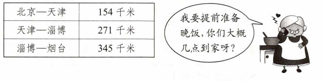 5. 淘气一家要从北京开车回烟台,途经天律、淄博。他们上午 9 时出发,2 时后到达天津。他们后续计划休息 1 时左右,照这样计算,淘气可以怎么回复姥姥?