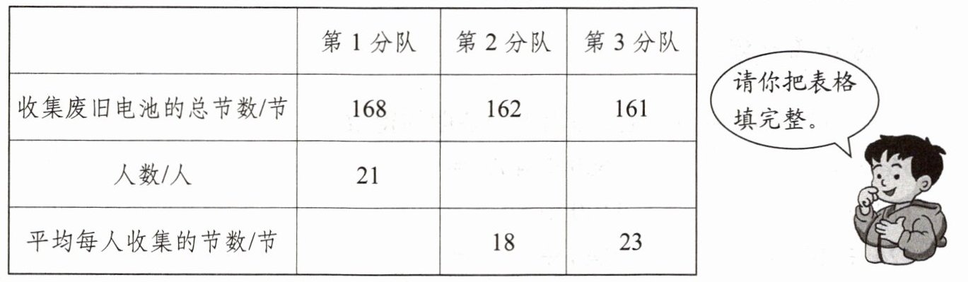 4. 育才小学四(1)班“环保小卫士”组织 3 个分队收集废旧电池,统计情况如下表。