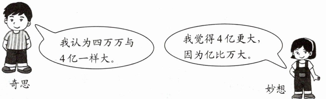 我同意奇思的说法。四万万即40000个一万,$40000×10000 = 400000000$,400000000等于4亿。