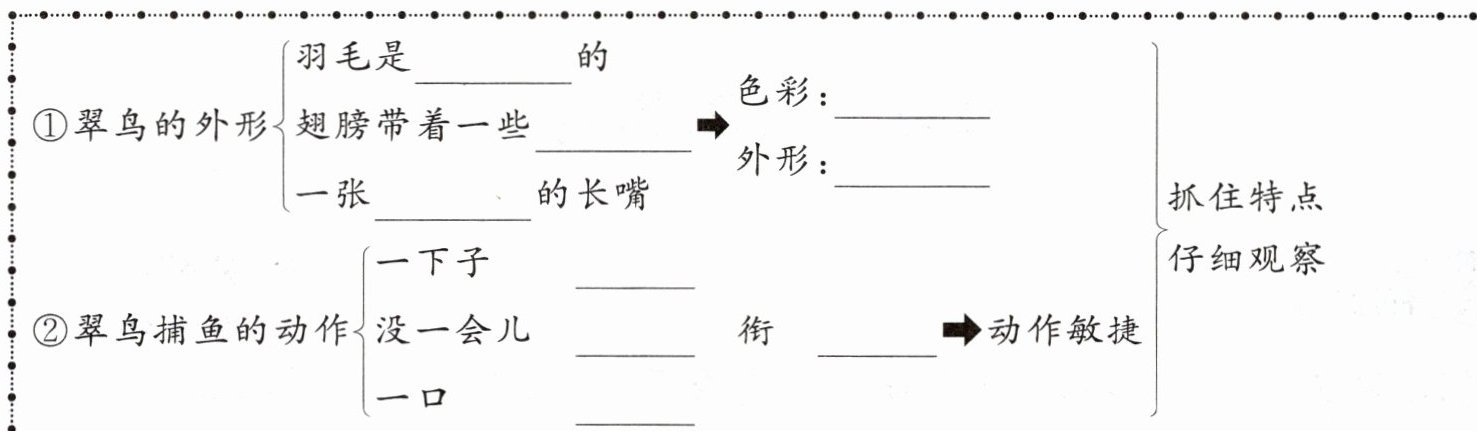 ①翠绿 蓝色 红色 鲜艳 美丽②冲 飞 站 吞 点拨:课文第2、4自然段分别描写了翠鸟的色彩和外形、捕鱼的动作,抓住关键词即可。