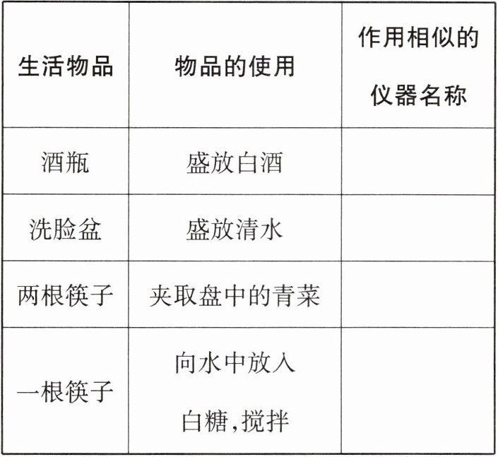 11. 生活中,有许多物品的使用与实验室中仪器的作用相似。请在图1-2-3中选择作用相似的仪器,将其名称填入下表中对应的位置。