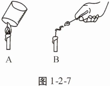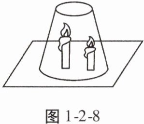 6. 对“高低不同的燃着的蜡烛罩上杯子后谁先熄灭”这一问题,甲、乙两位同学有不同的认识:甲同学认为高的蜡烛先熄灭,乙同学认为低的蜡烛先熄灭。他们谁也说服不了谁,于是设计了图1-2-8所示的实验来验证他们的猜想。(已知:二氧化碳含量增加,可使蜡烛熄灭,且对人体有很大的危害)